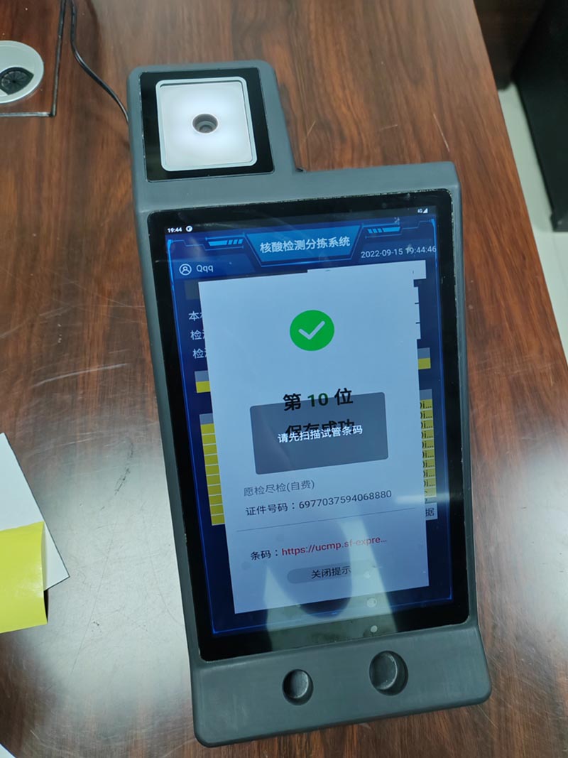 5、依次進(jìn)行,滿了5人或者10人或者20人后,系統(tǒng)提示掃試管碼,同時(shí)上報(bào)數(shù)據(jù)給衛(wèi)健委平臺(tái);