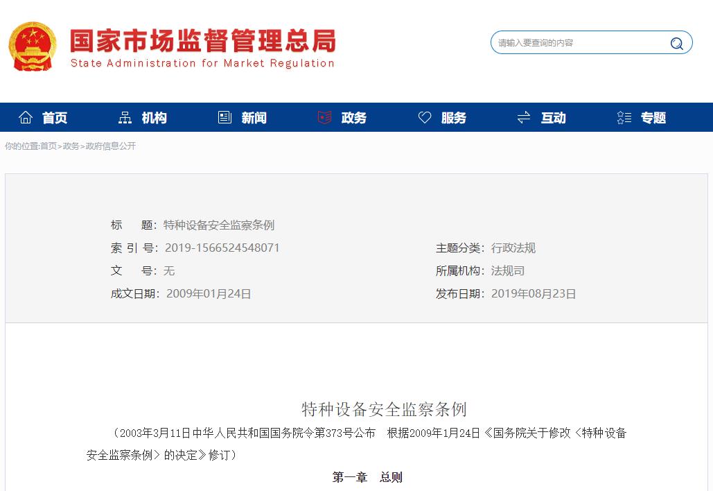 《特種設(shè)備安全監(jiān)察條例》2019年08月23日 國(guó)家市場(chǎng)監(jiān)督管理總局